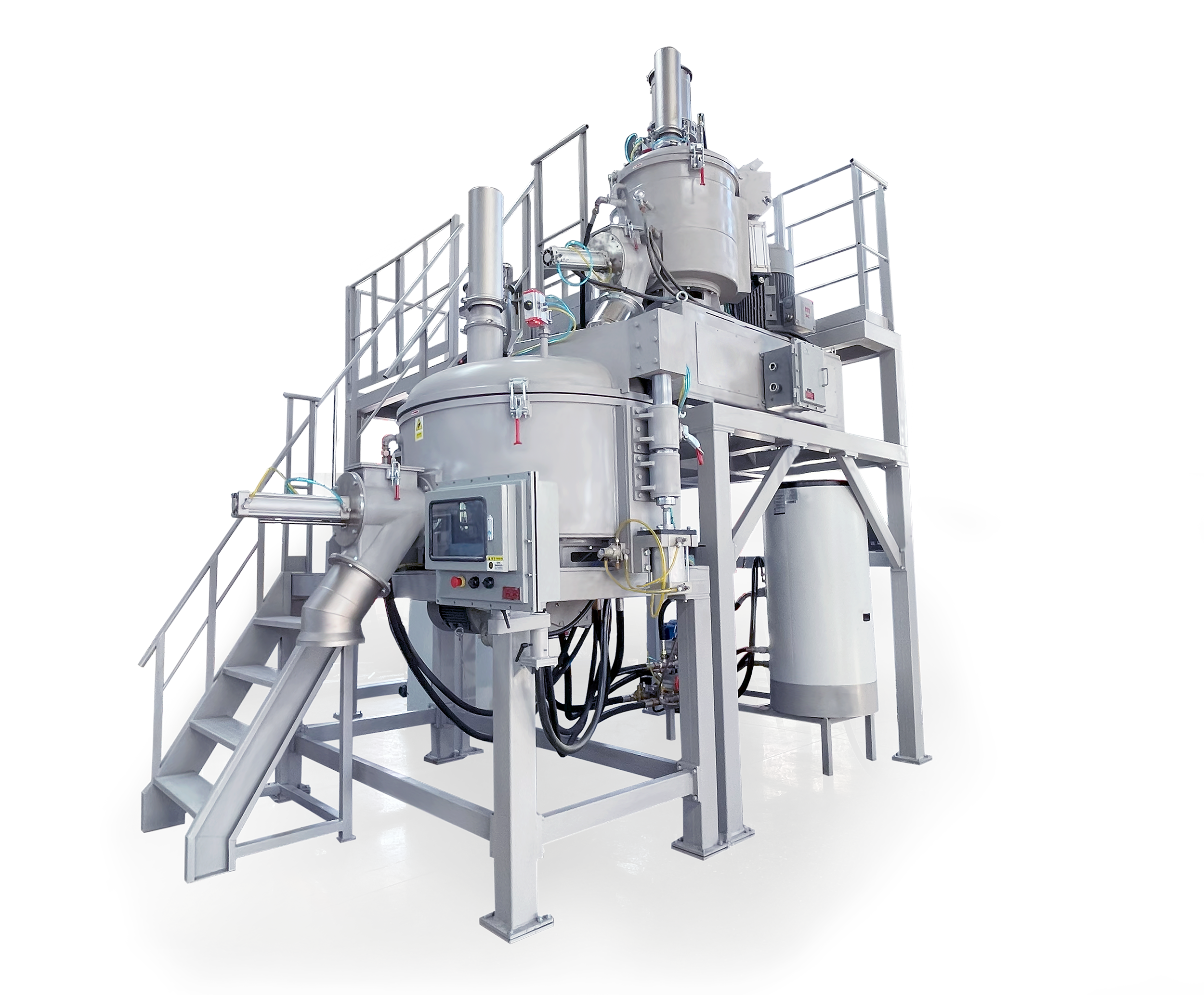 該設備混料罐采用惰性氣體吹洗,配有防爆系統(tǒng)和雙重密封系統(tǒng),邦定罐和冷卻罐配有夾層水冷系統(tǒng),罐體采用大圓弧設計,折流板的角度和高低可任意調節(jié),自潔性好,升溫均勻。